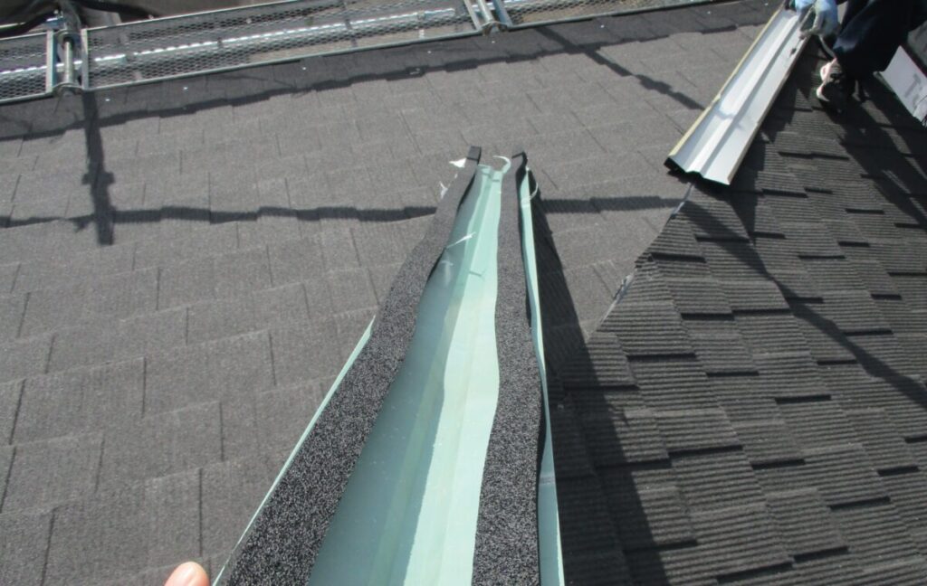 本体の張り合わせの部分に棟を取り付けていきます。棟といっても3つのパーツで構成されています。棟下地の金属製棟用スペーサー、雨水の浸入を防ぐエプトシーラー、天然石付きの棟カバーで構成されています。初めに棟用スペーサーの裏側にエプトシーラーを貼り本体側に圧着してビスで取り付けます。最後に石付の棟カバーを取り付けたら完成です。