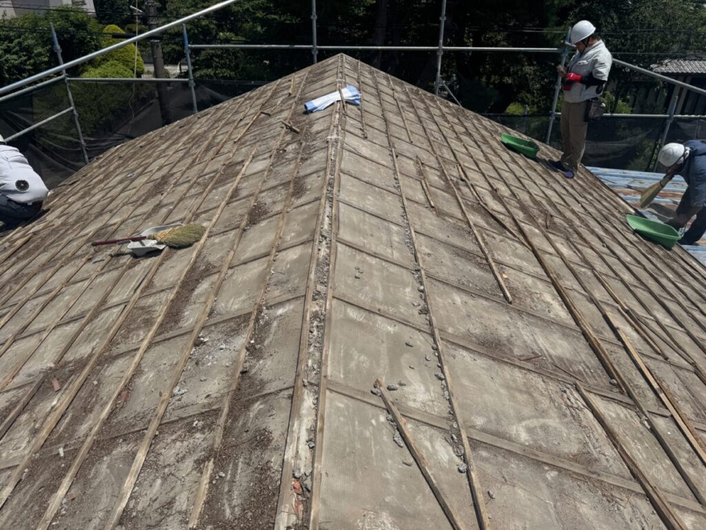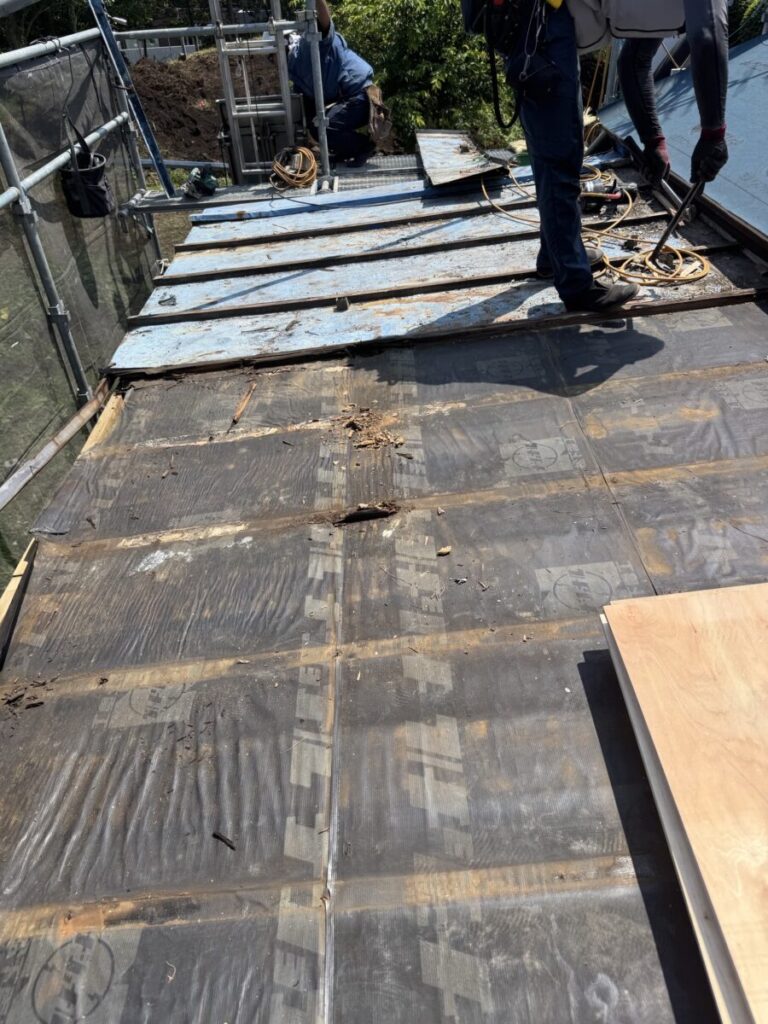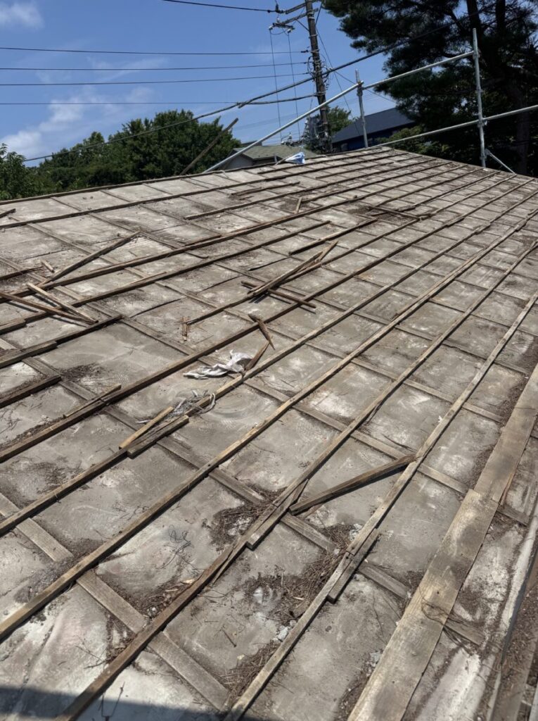 既存屋根材を撤去して下地補強をしています。