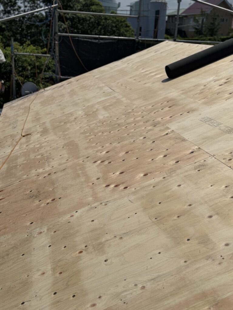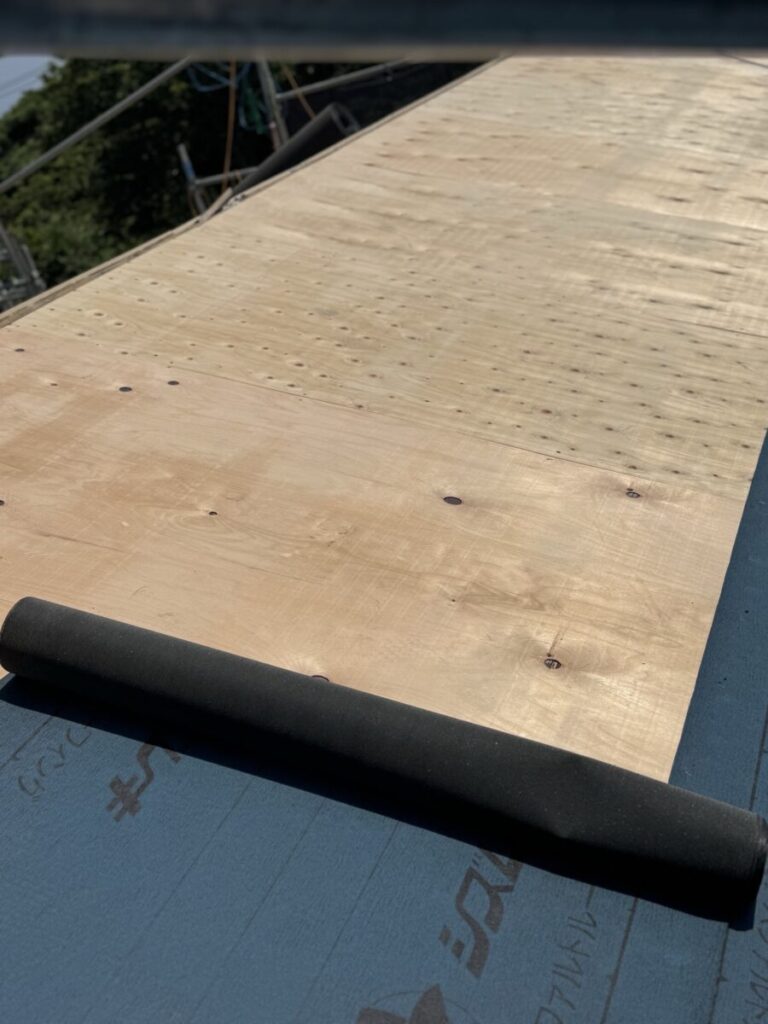 合板の上に防水シート(改質アスファルトルーフィング)を張っていきます。