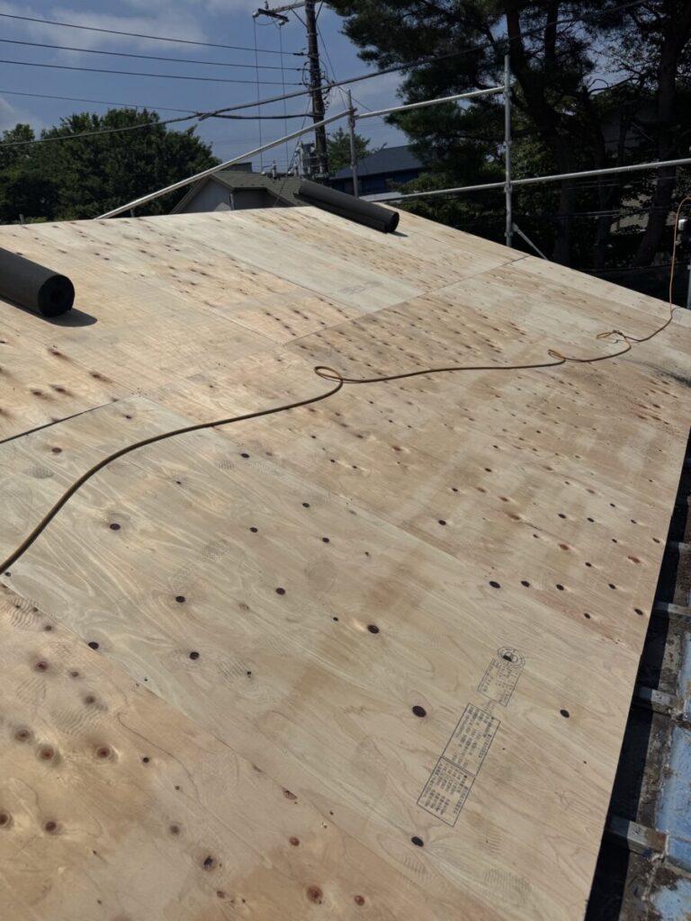 瓦と瓦棒のトタンを撤去したら構造用合板の12㎜を張り詰めていきます。今回は下地の垂木に留めて下地を補強していきます。