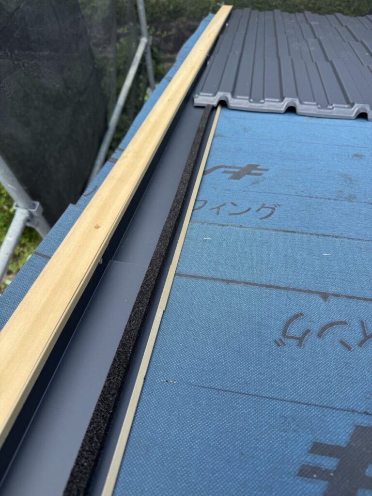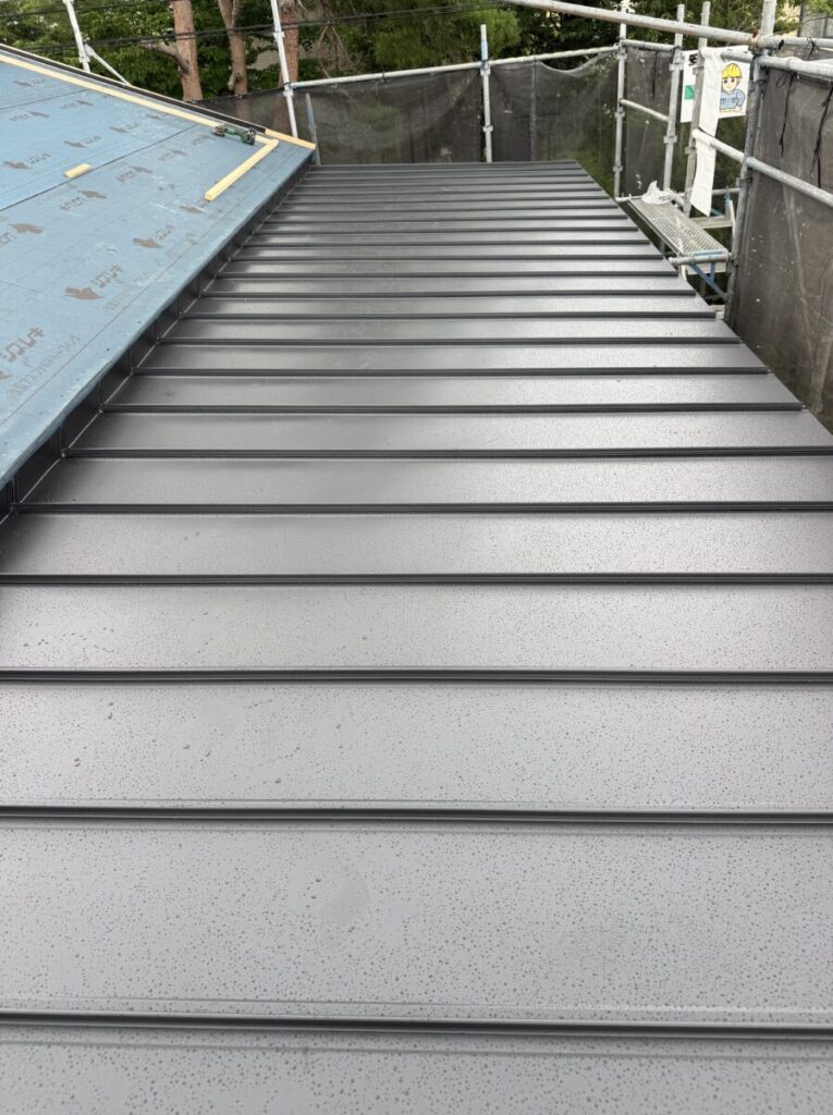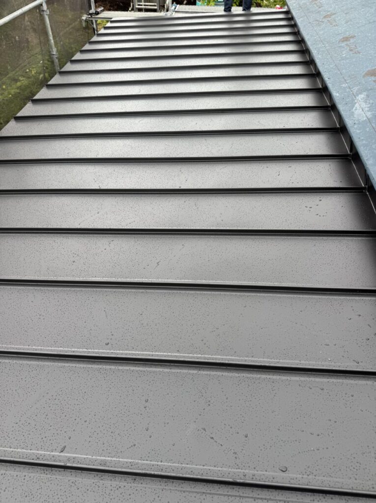 下屋根の「立平葺き」を張り、上屋根に「レクトプルーフ」を張っていきます。