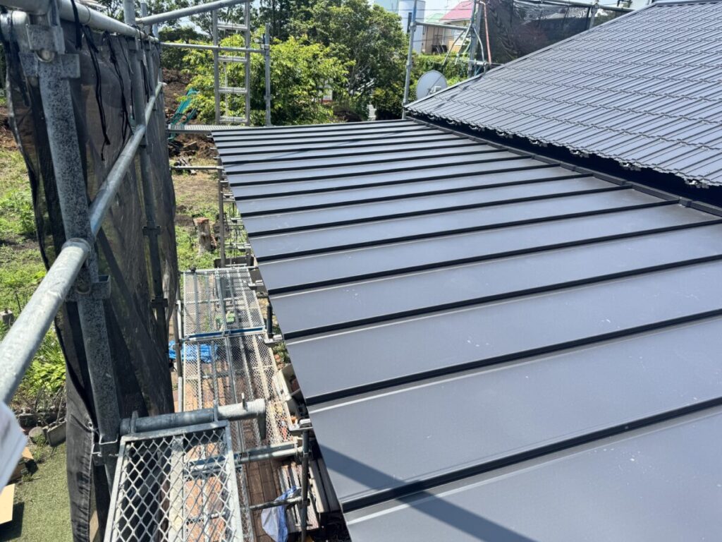 静岡県伊東市 雨漏りしている瓦葺屋根を撤去してレクトプルーフに、瓦棒葺きは撤去して立平葺きに葺き替え工事