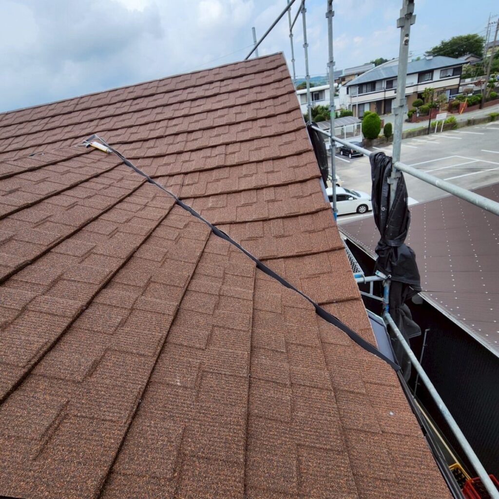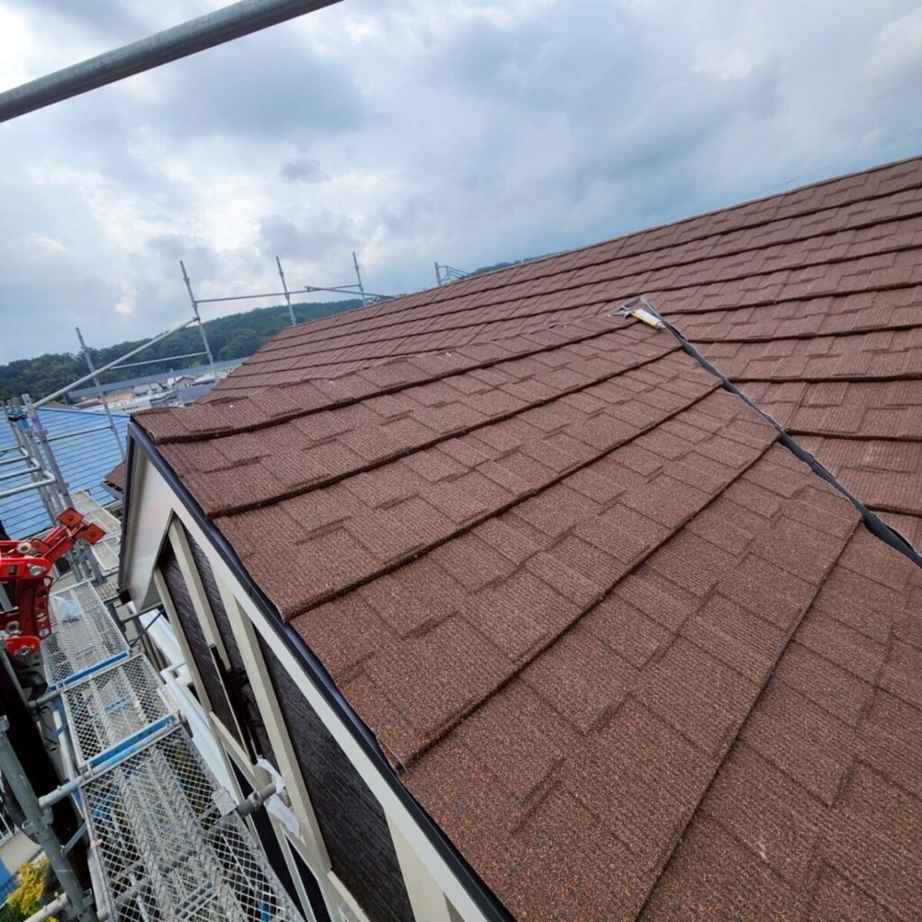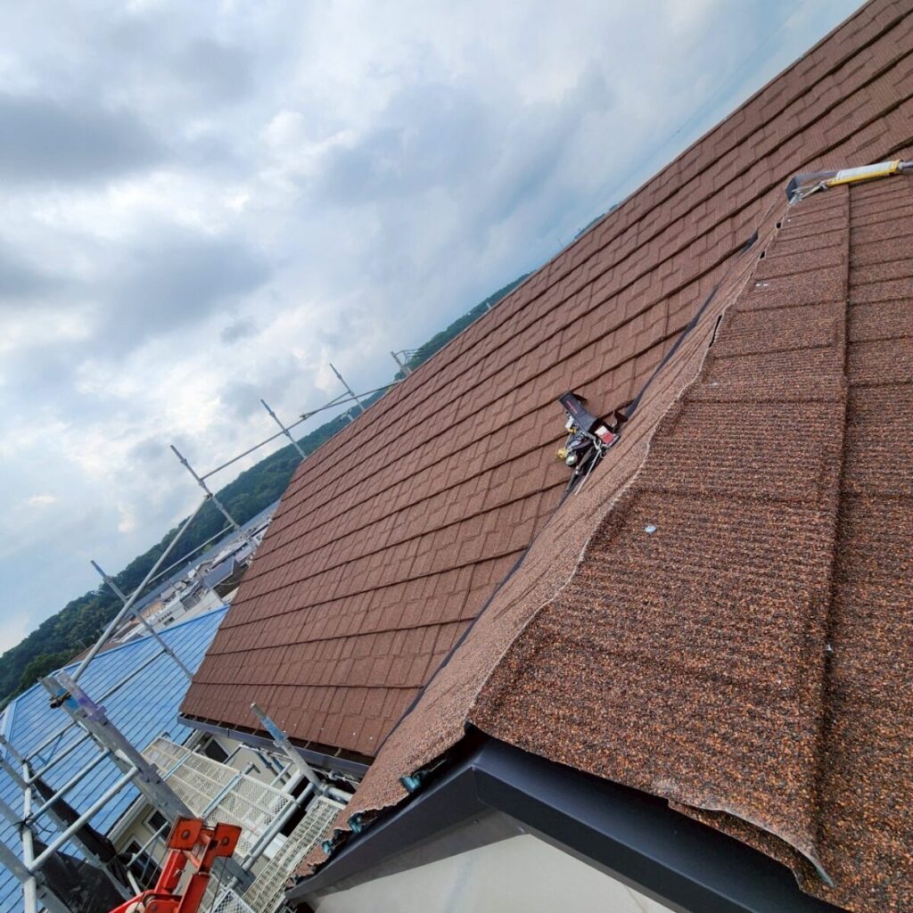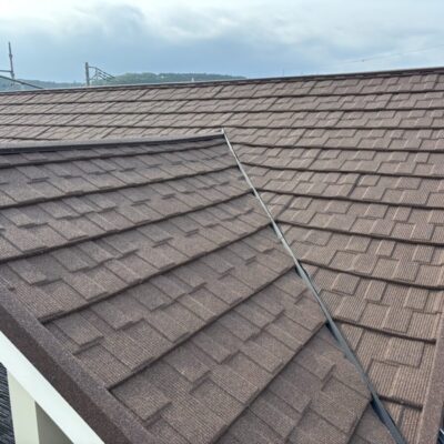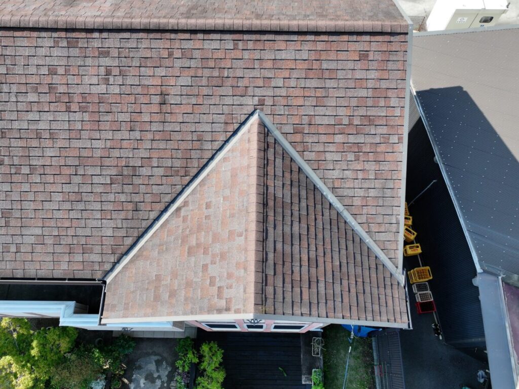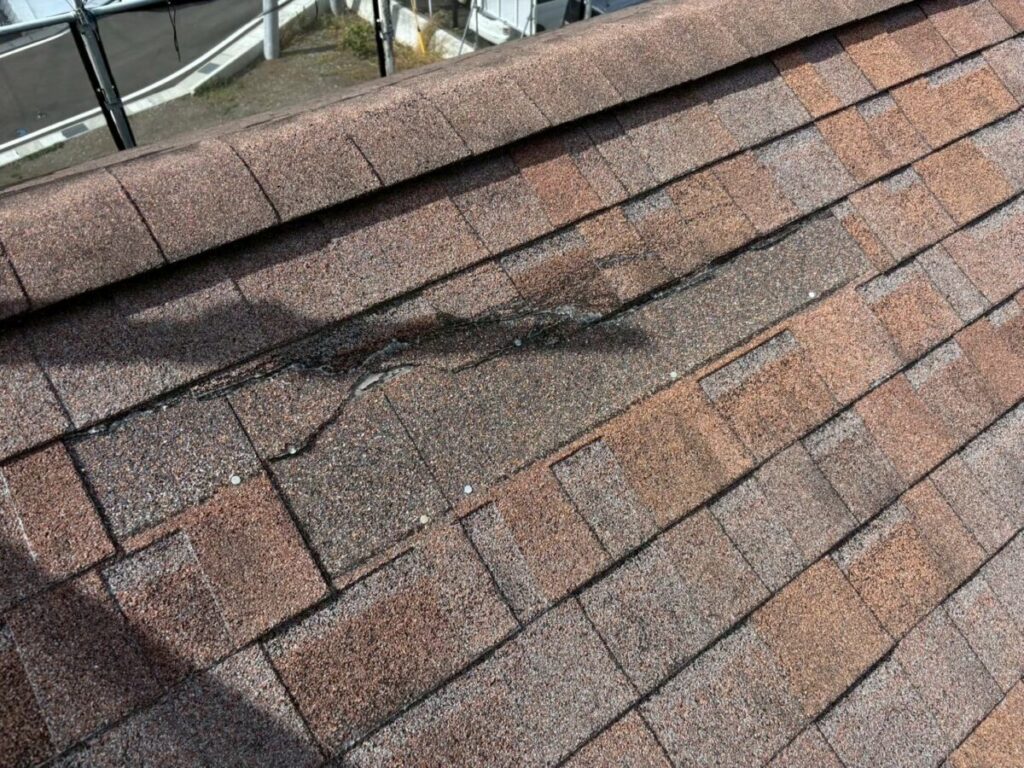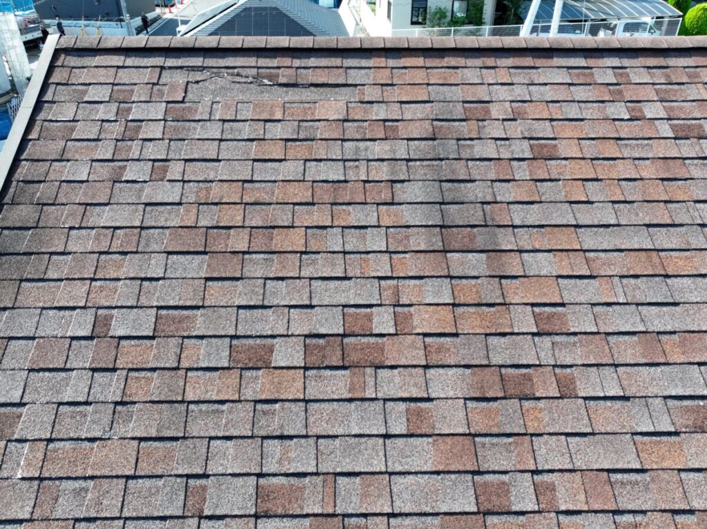今回の屋根材はアスファルトシングルでしたが、調査の結果、一部で屋根材の破損が確認できました。屋根材の傷みが進んでしまうと、表面だけでなく内部に雨水が回りやすくなり、雨漏りの原因につながることがあります。特に南面は紫外線の影響を受けやすい箇所になり劣化が出やすく、早めの対応が大切です。