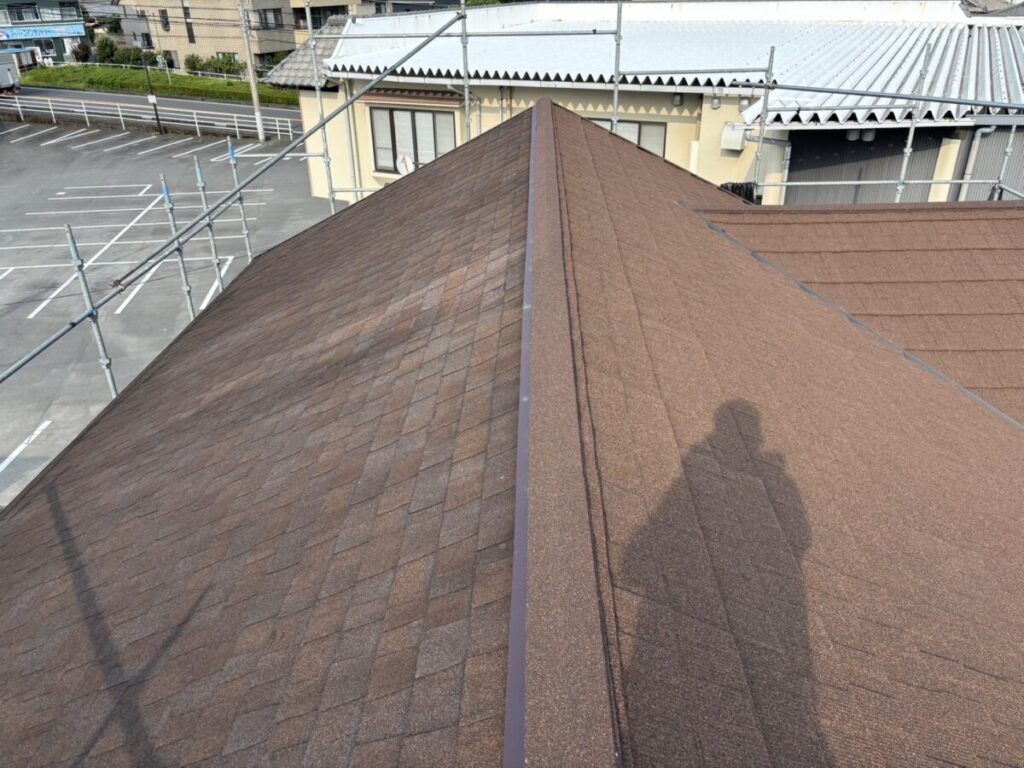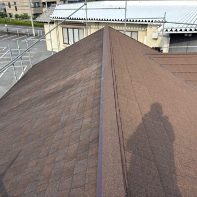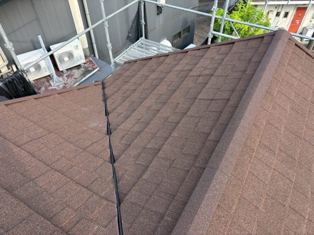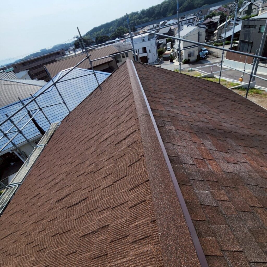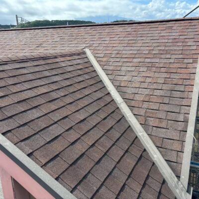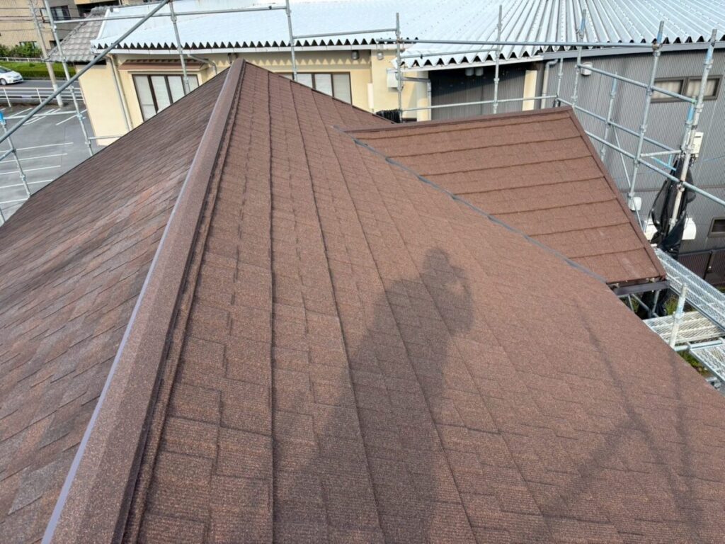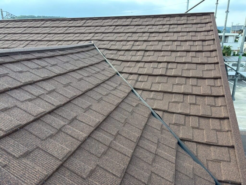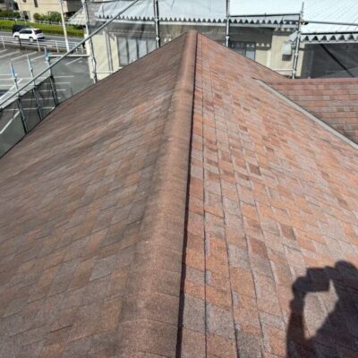 今回の屋根材はアスファルトシングルでしたが、調査の結果、一部で屋根材の破損が確認できました。屋根材の傷みが進んでしまうと、表面だけでなく内部に雨水が回りやすくなり、雨漏りの原因につながることがあります。特に南面は紫外線の影響を受けやすい箇所になり劣化が出やすく、早めの対応が大切です。