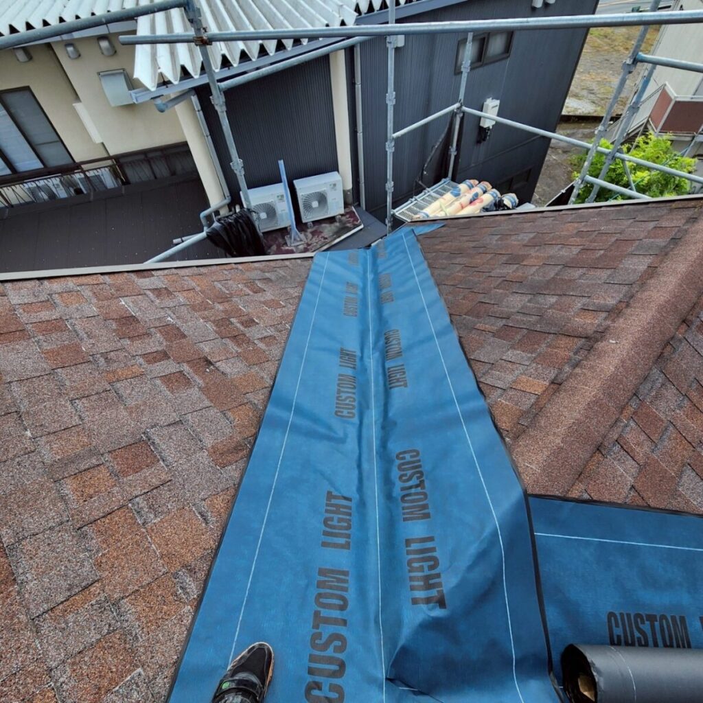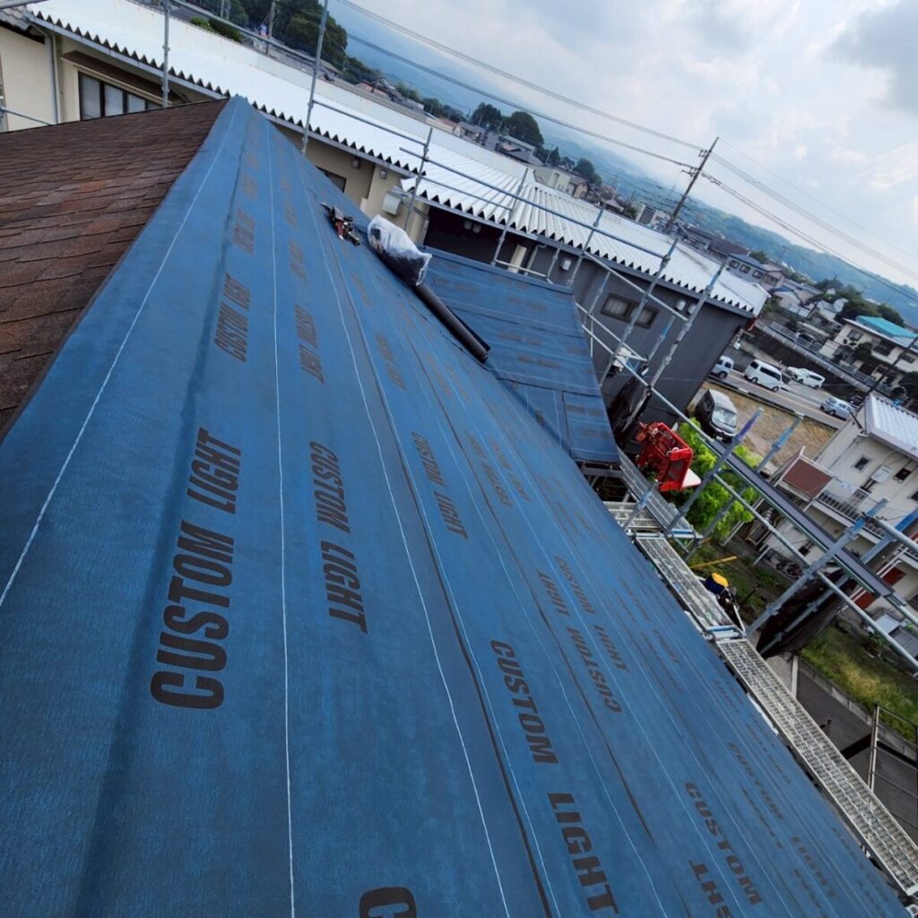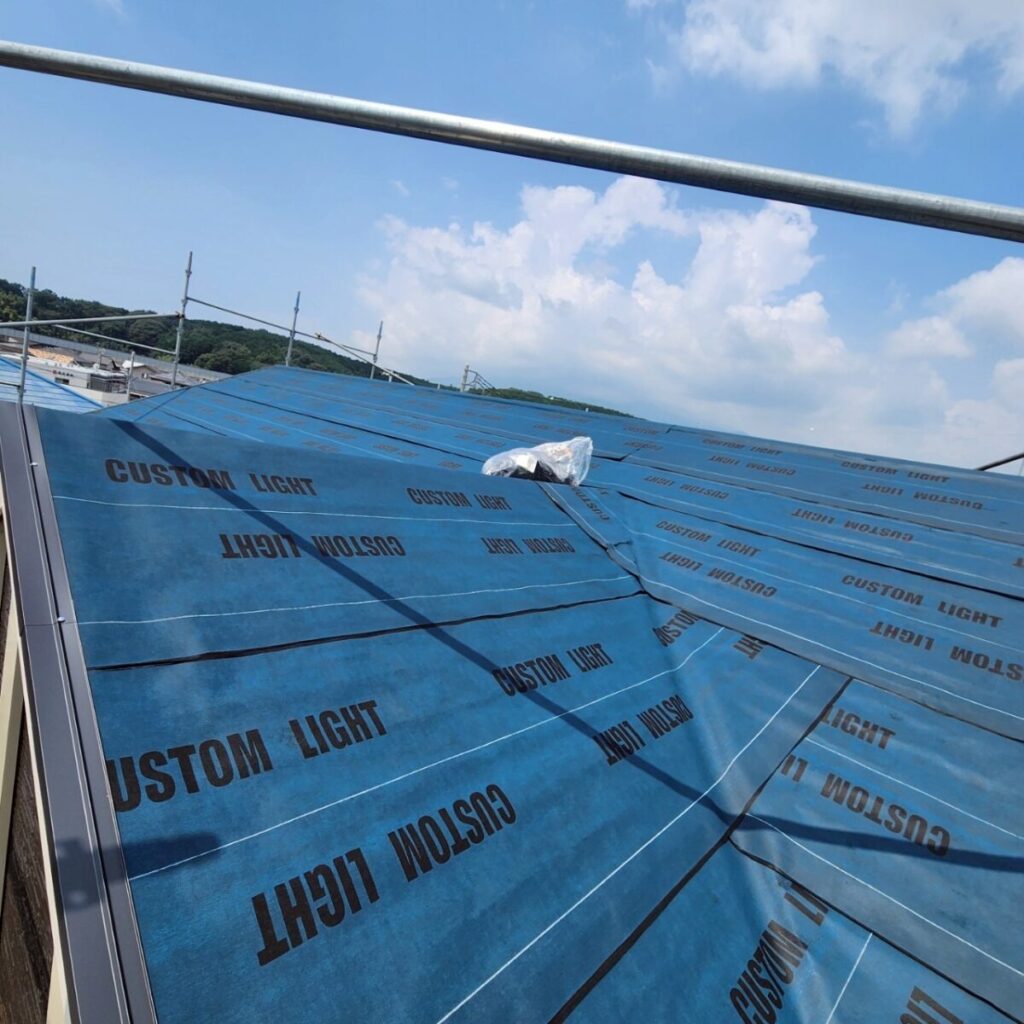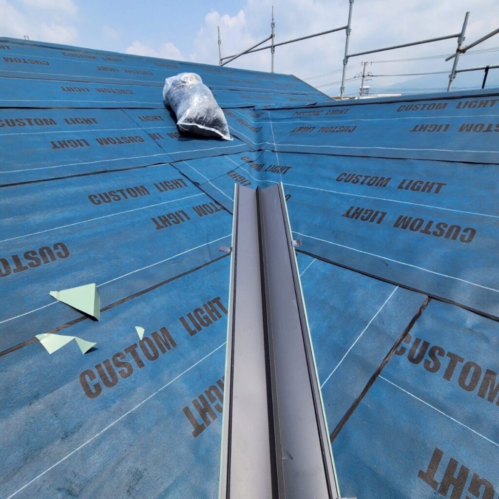 まずは既存屋根の上から、新しい防水層となるルーフィングを敷いていきます。ルーフィングは屋根材の下に施工される防水シートで、万が一屋根材の隙間から雨水が入り込んだ場合でも、建物内部へ水が回るのを防ぐ大切な役割があります。屋根工事では表に見える仕上がりも大事ですが、実際にはこの下葺き材の施工がとても重要になります。今回の施工には裏面に粘着層のあるルーフィングを使用しました。
