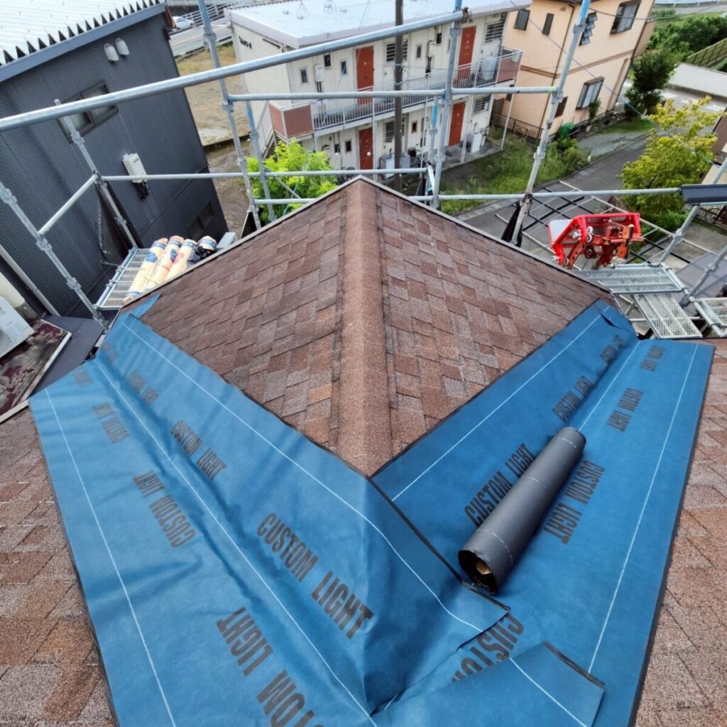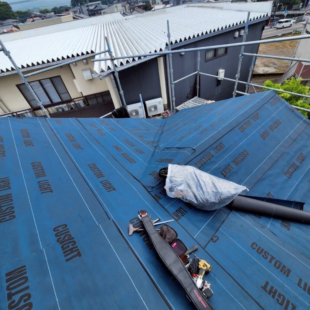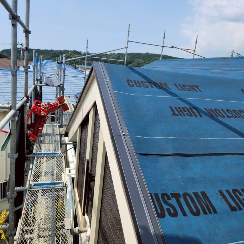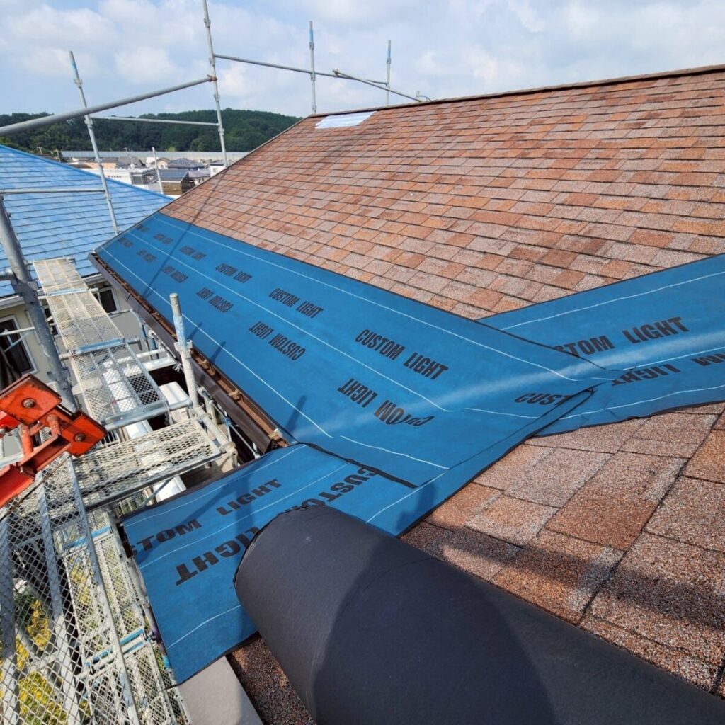 まずは既存屋根の上から、新しい防水層となるルーフィングを敷いていきます。ルーフィングは屋根材の下に施工される防水シートで、万が一屋根材の隙間から雨水が入り込んだ場合でも、建物内部へ水が回るのを防ぐ大切な役割があります。屋根工事では表に見える仕上がりも大事ですが、実際にはこの下葺き材の施工がとても重要になります。今回の施工には裏面に粘着層のあるルーフィングを使用しました。