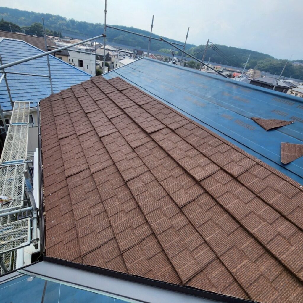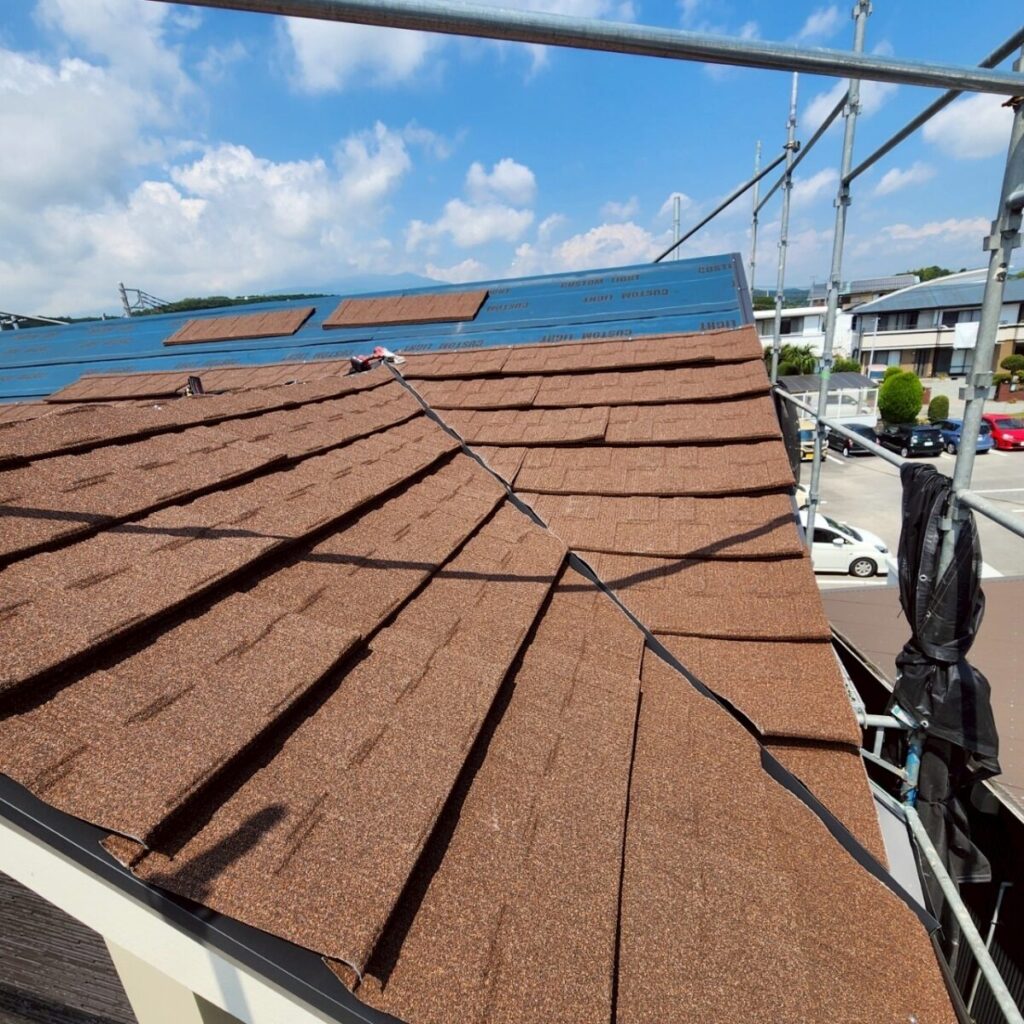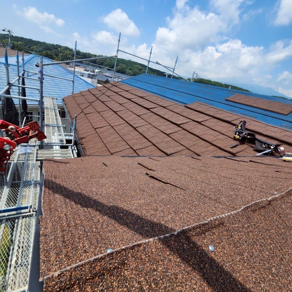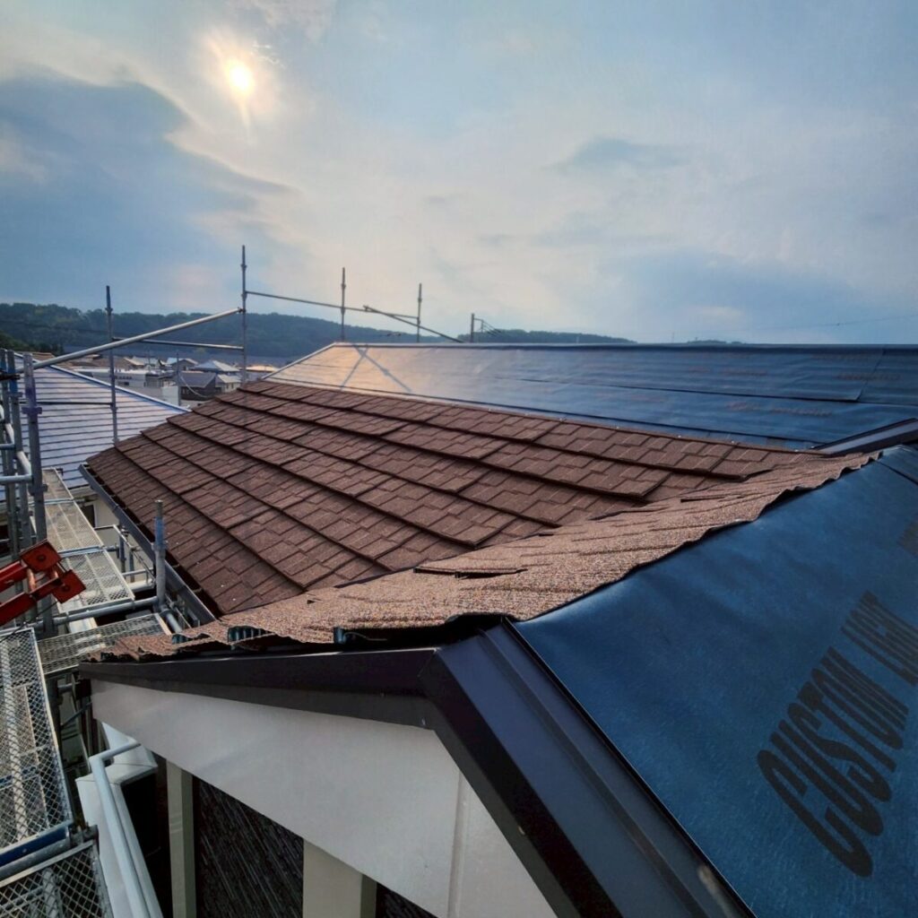 まずは既存屋根の上から、新しい防水層となるルーフィングを敷いていきます。ルーフィングは屋根材の下に施工される防水シートで、万が一屋根材の隙間から雨水が入り込んだ場合でも、建物内部へ水が回るのを防ぐ大切な役割があります。屋根工事では表に見える仕上がりも大事ですが、実際にはこの下葺き材の施工がとても重要になります。今回の施工には裏面に粘着層のあるルーフィングを使用しました。