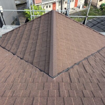 屋根本体の施工が終わったら、最後の仕上げとして棟部分を取り付けていきます。棟は屋根のてっぺんにあたる部分で、左右の屋根面が合わさる大切な場所です。雨水が入りやすいところでもあるため、見た目以上に重要な工程になります。まずは、棟の下地となる棟用スペーサーにしっかりシーラーを取り付けてから、屋根材どうしが合わさる部分に固定していきます。その上から、天然石の付いた棟板金をかぶせて取り付けていきます。下地の取り付けが十分でないと、強い風が吹いたときに浮いてしまったり、後々不具合の原因になったりすることがあります。そのため、固定の状態を確認しながら、ていねいに施工を進めました。棟板金は屋根全体の見た目を引き締める部分でもあるので、ラインがまっすぐきれいに見えるよう意識して取り付けています。工事もいよいよ完成が近づいてきました。屋根本体の施工が完了した後は、最後の仕上げとなる棟部分の取り付けを行っていきます。