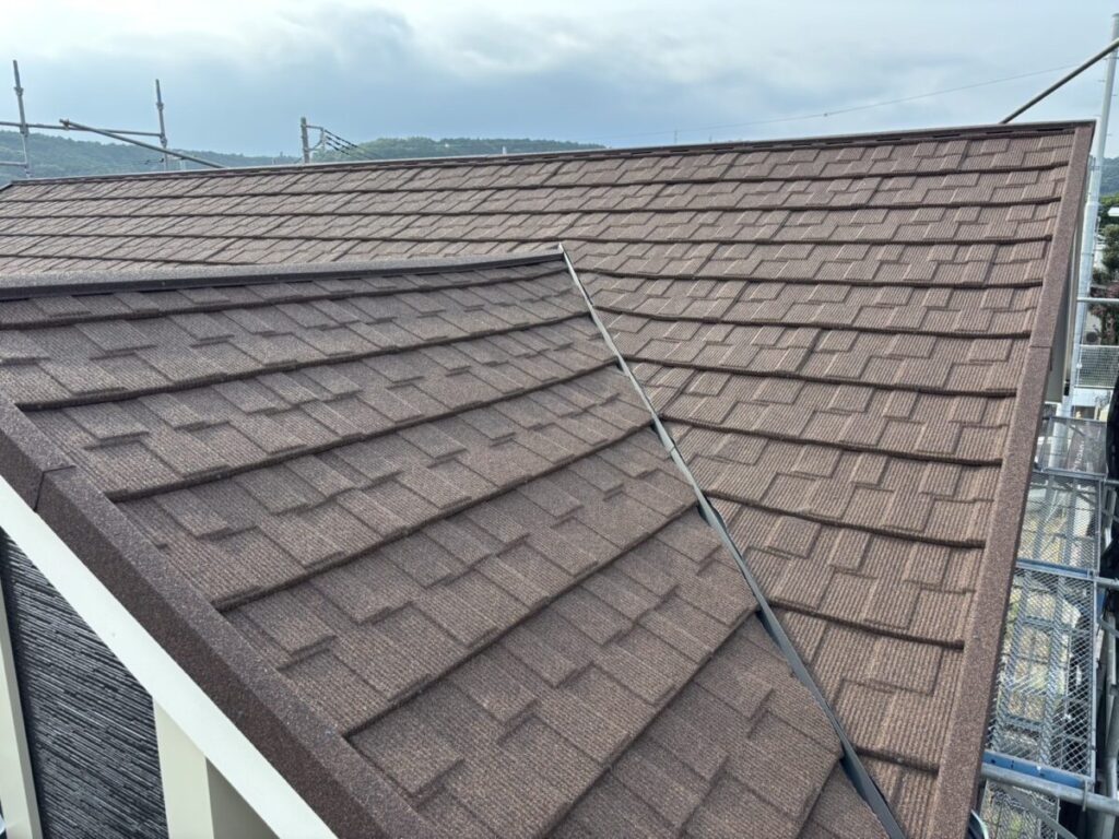 今回使用する屋根材は、天然石粒付きガルバリウム鋼板製のセネターです。軽量で耐久性が高く、さらに重厚感のある見た目に仕上がるため、機能面と意匠性の両方を兼ね備えた屋根材です。