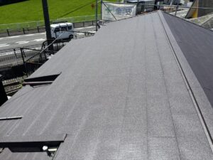 今回は全面的な葺き替えではなく4面あるうちの天窓が取り付けられている1面の屋根を葺き替えるため屋根材は既存の屋根と同じエバールーフを使用します。最後に棟を取り付けたら完成となります。