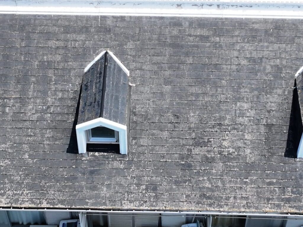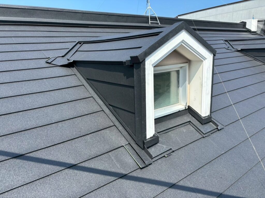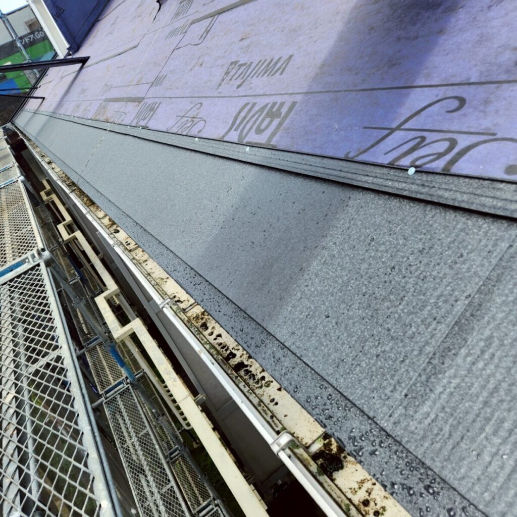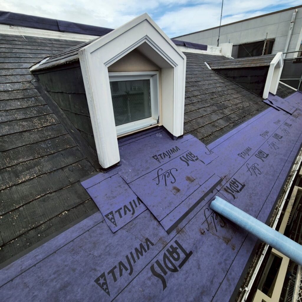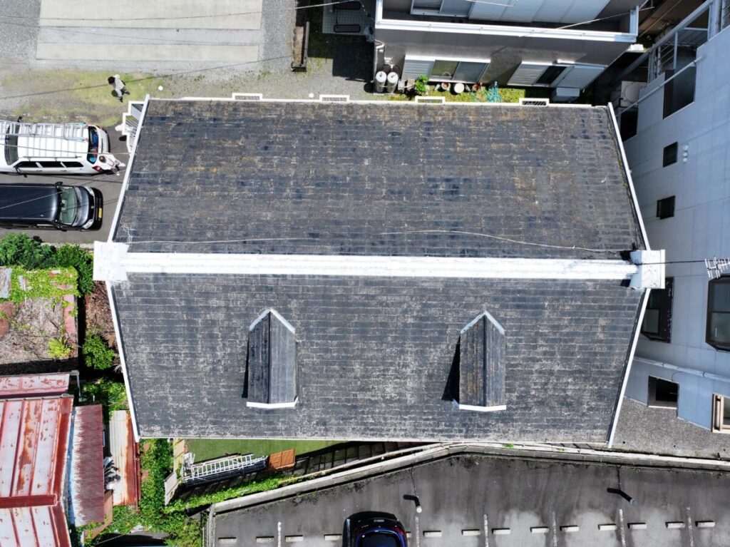 集合住宅のオーナー様から屋根材がズレているとご相談があり現地調査に伺いました。ドローンで屋根の状態を確認するとドーマの前側の屋根材1枚がズレて落下しそうな状態になっていました。ズレた1枚を原状復帰するお見積りと、合わせて全面的なカバー工法も検討したいとの事でしたのでガルバリウム鋼板製のシルキーG2の2通りの御見積書を提出しご検討していただきました。築年数が35年以上経過しているので今後の雨漏りや割れによる飛散等のリスクを考慮し全面をシルキーG2でカバーする屋根重ね葺き工事をすることとなりました。