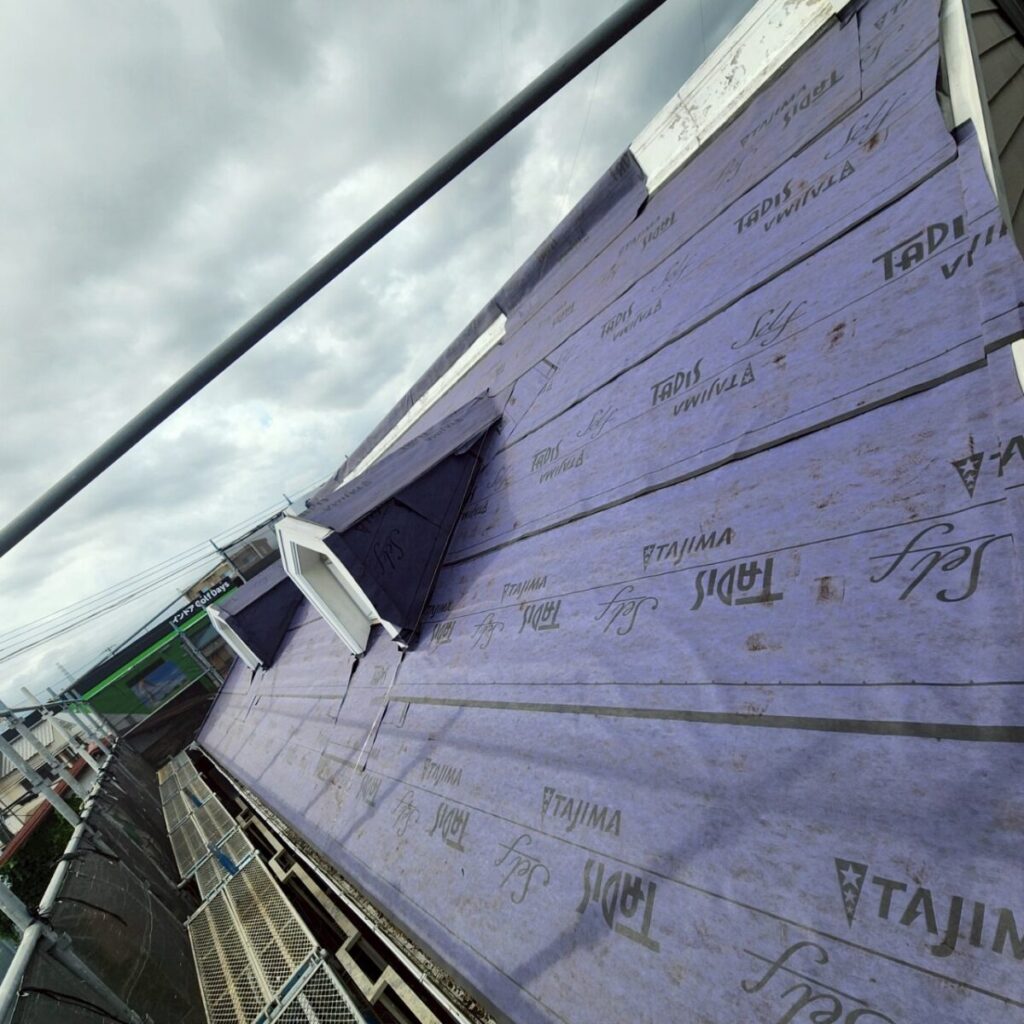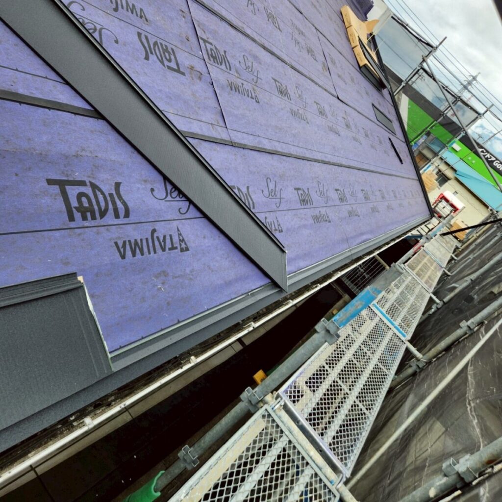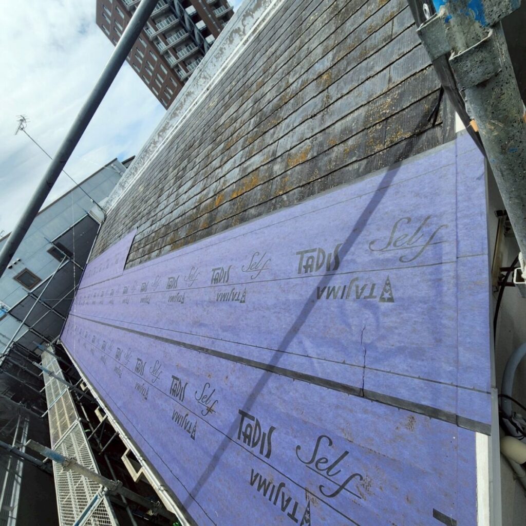 軒先から順に粘着層付き改質アスファルトルーフィング(防水シート)を張っていきます。
