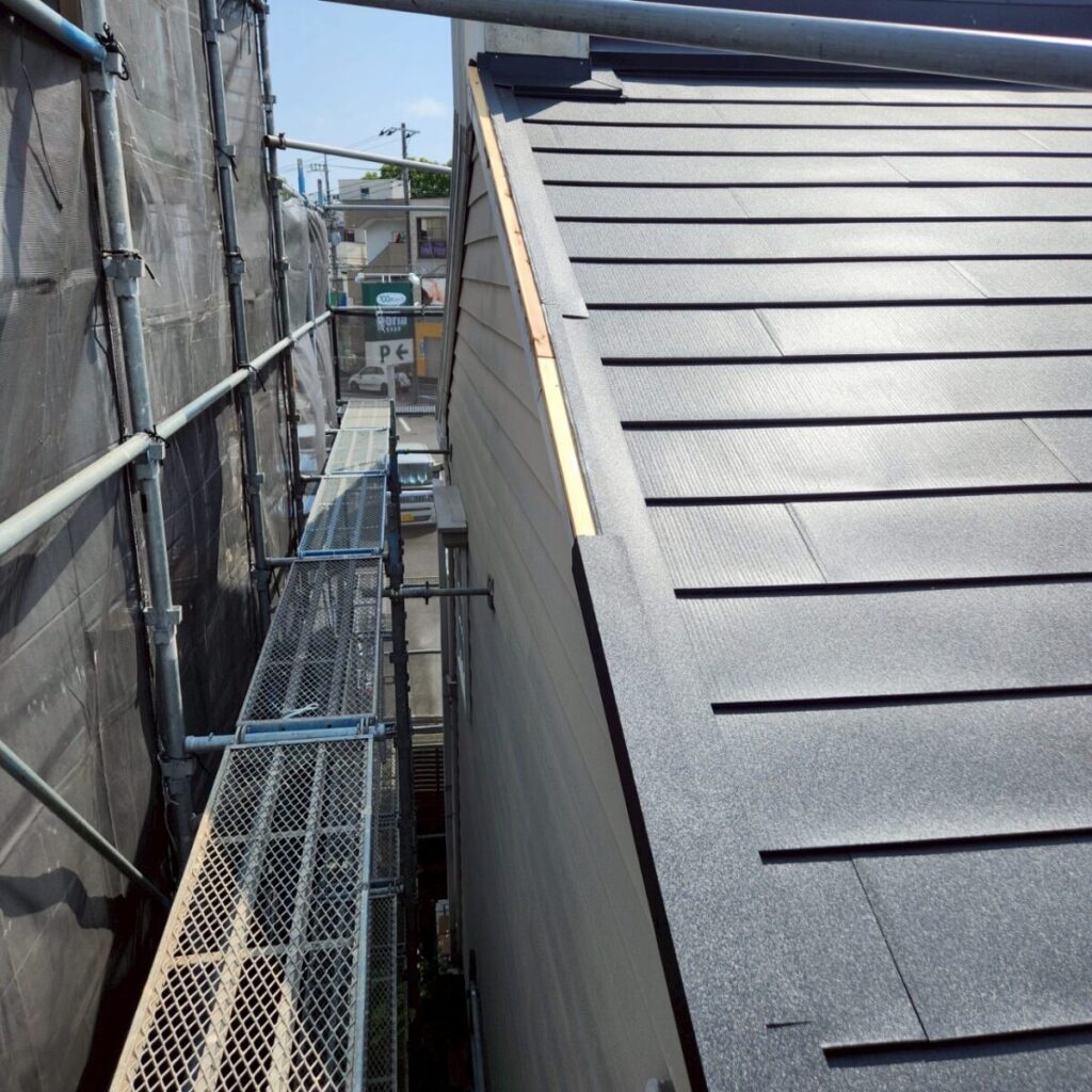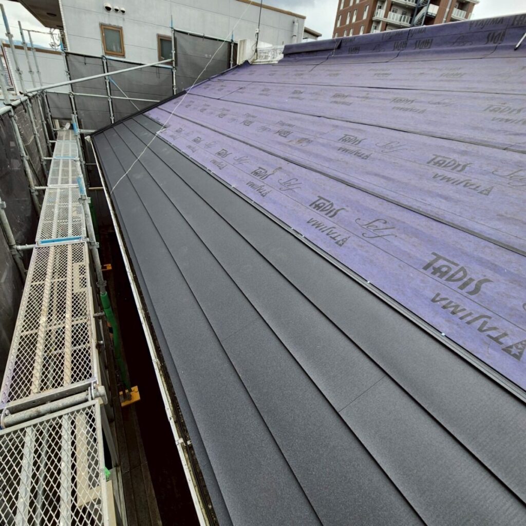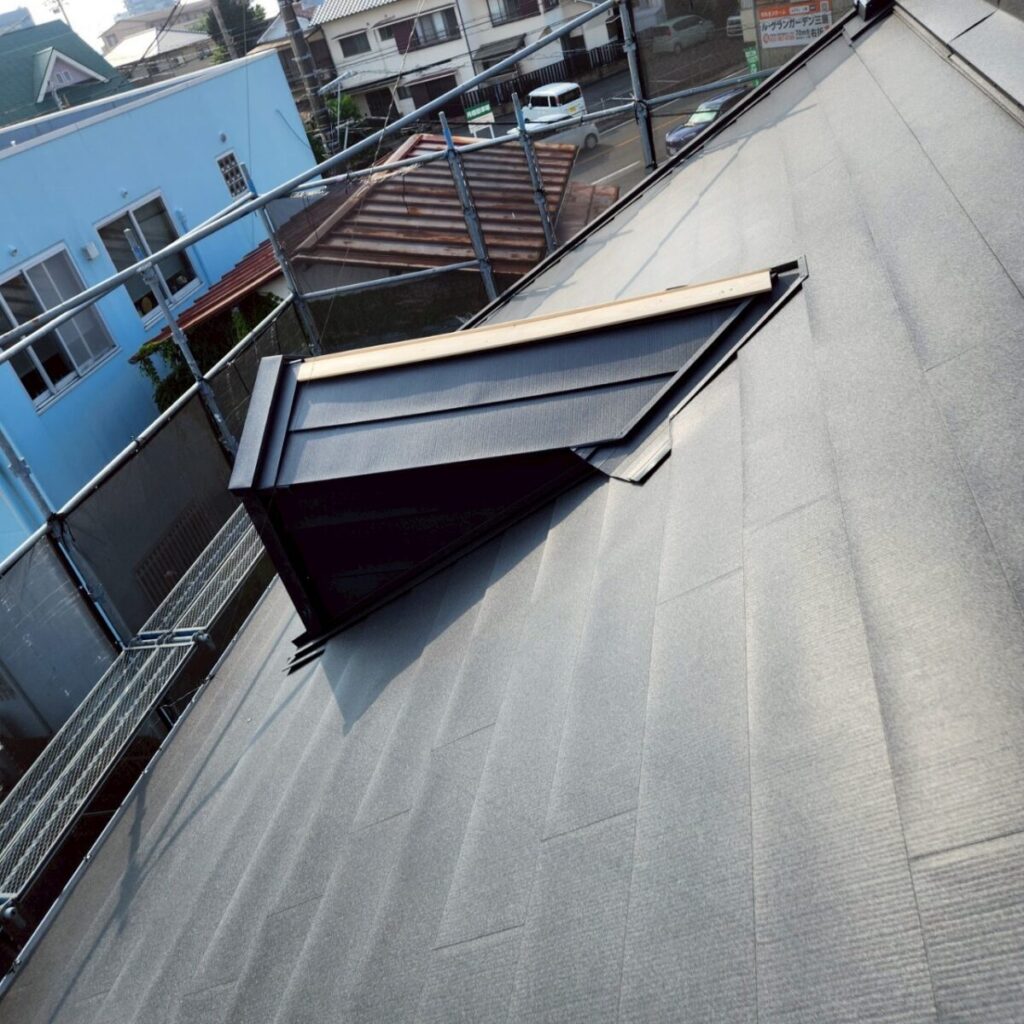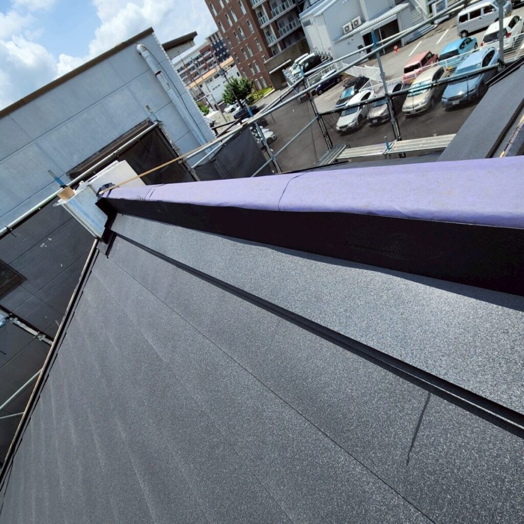 集合住宅の屋根「化粧スレート」→ガルバリウム鋼板「シルキーG2」を重ね葺き